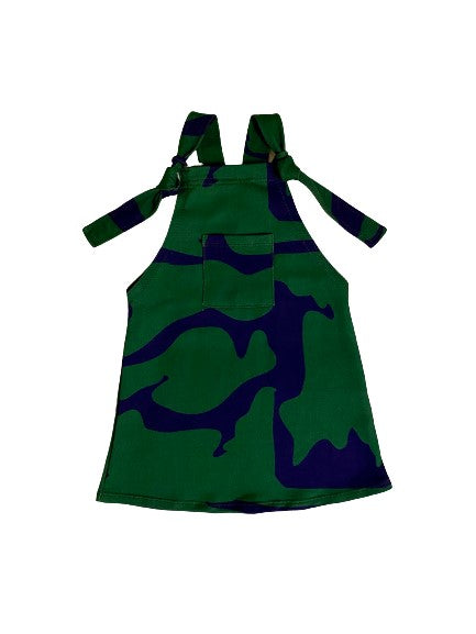 Model dungarees dressed in blue and green colors with adjustable straps on the shoulders, in the image the representation of the Amazon river basin full of purpose and meaning.