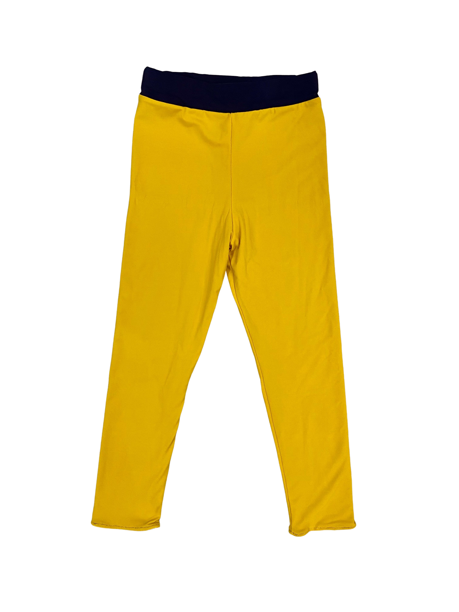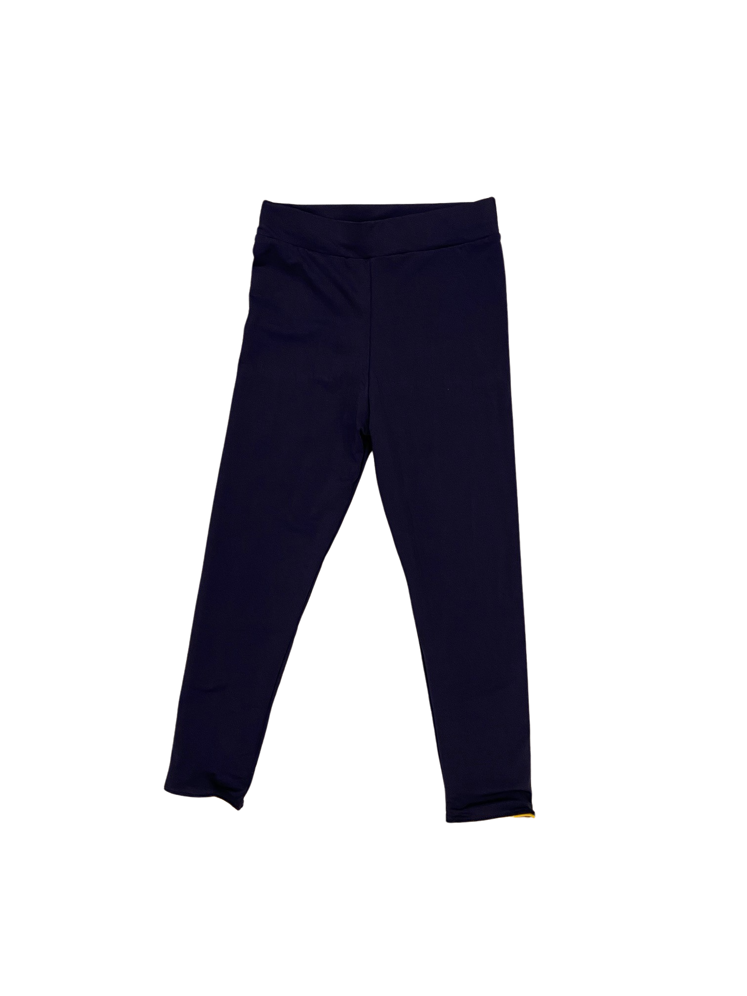 Leggings made from biodegradable fabric. The leggings fit snugly against the body. The leggings are double-sided, with one side in navy blue and the other in yellow. Ideal for everything!