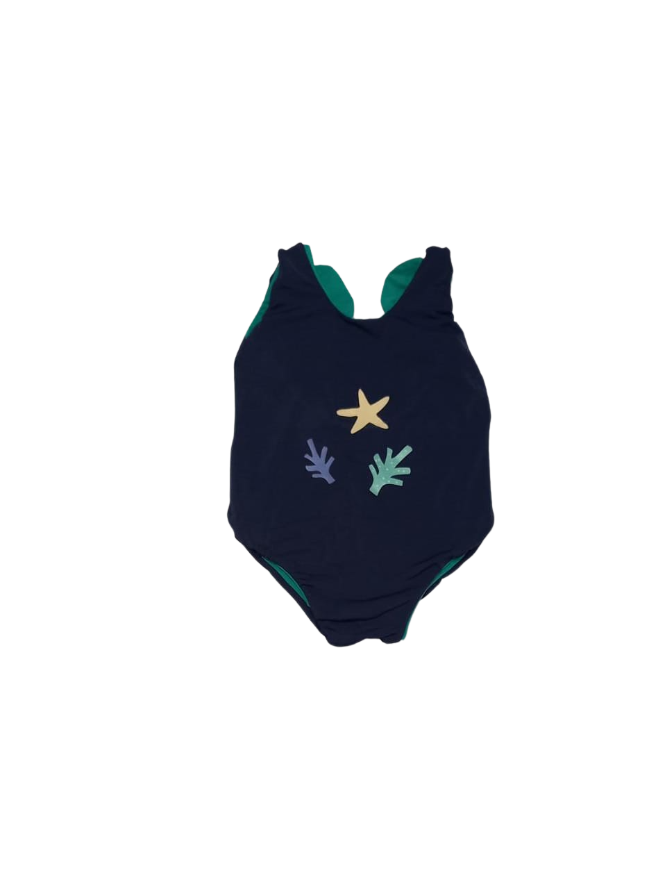Double-sided swimsuit in navy blue with an applied print of Ocean corals and a green back made of biodegradable polyamide, 50+ protection.