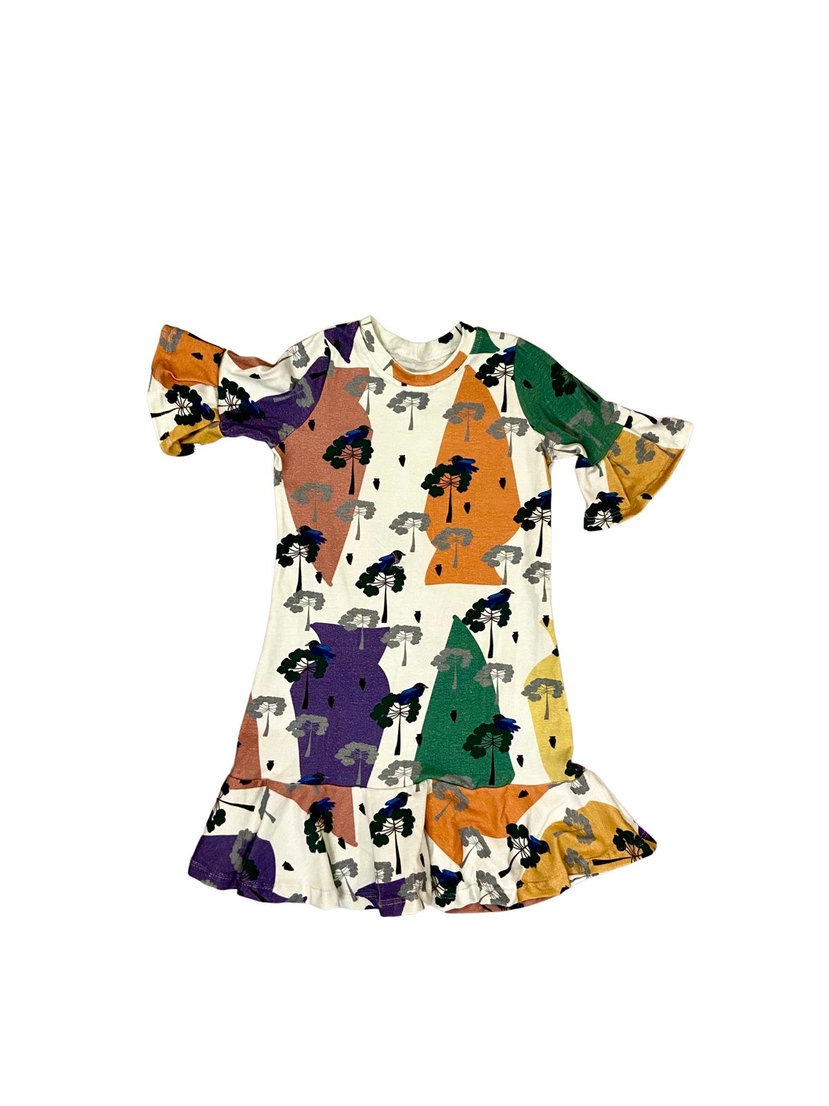 Half sleeve dress with slight opening on the sleeve and flared hem. In this print you can see the color of the pine nut fruit and the blue crow bird.