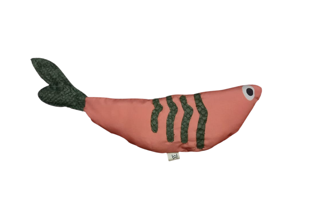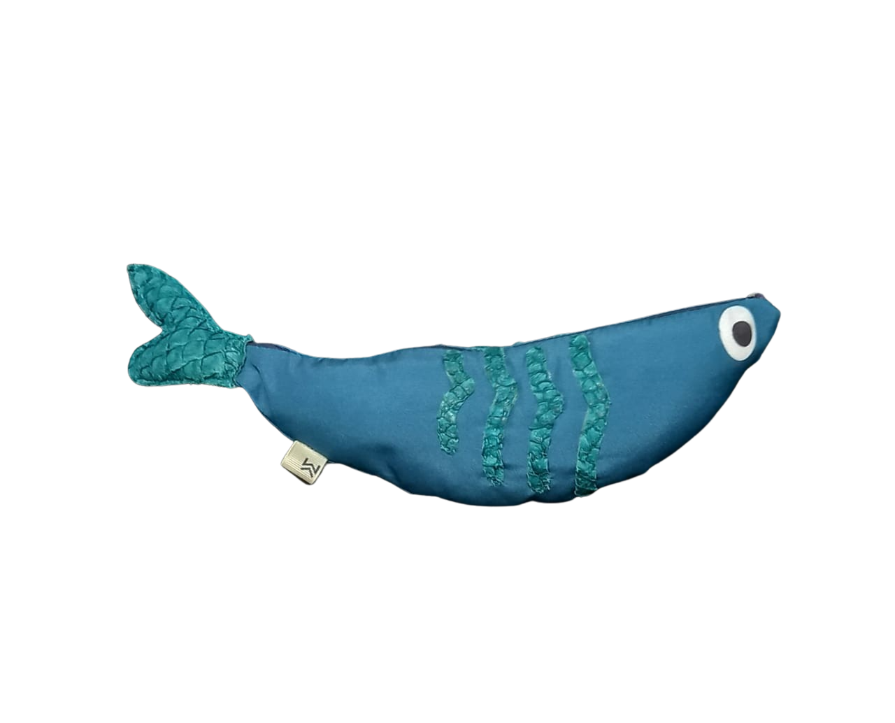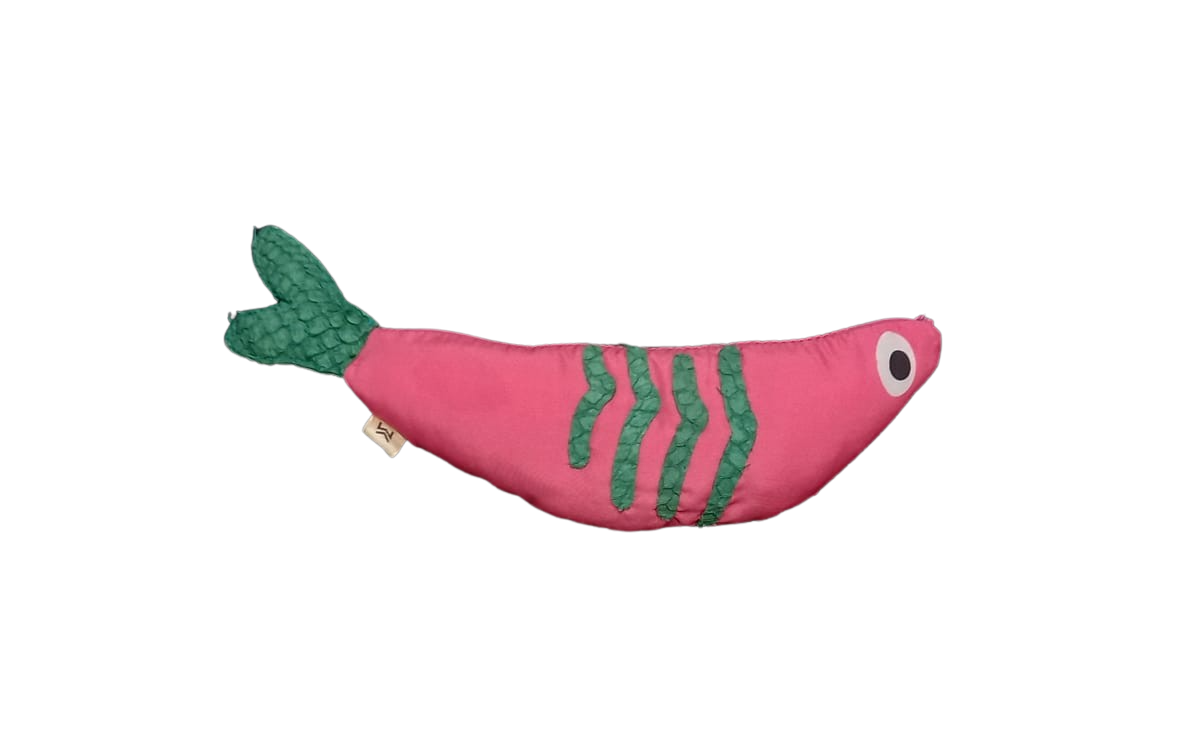 Estojo confeccionado por mulheres artesãs em tecido PET com aplicações de couro de peixe. Dentro do estojo o desenho da espinha de peixe com a mensagem Conserve nossos oceanos!
