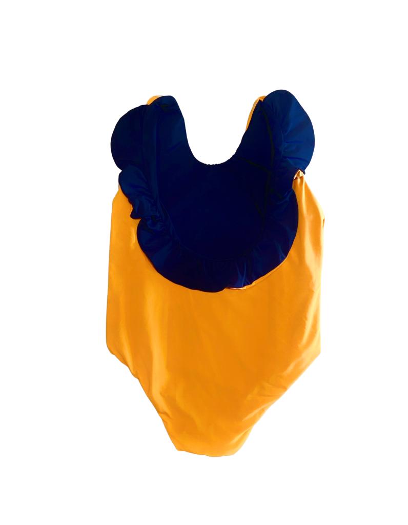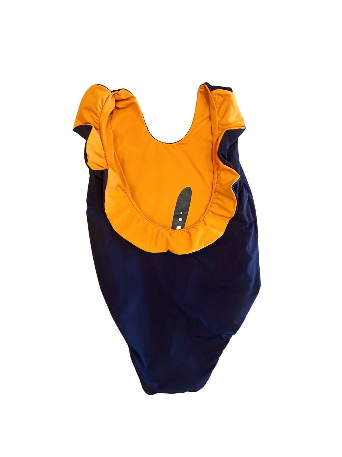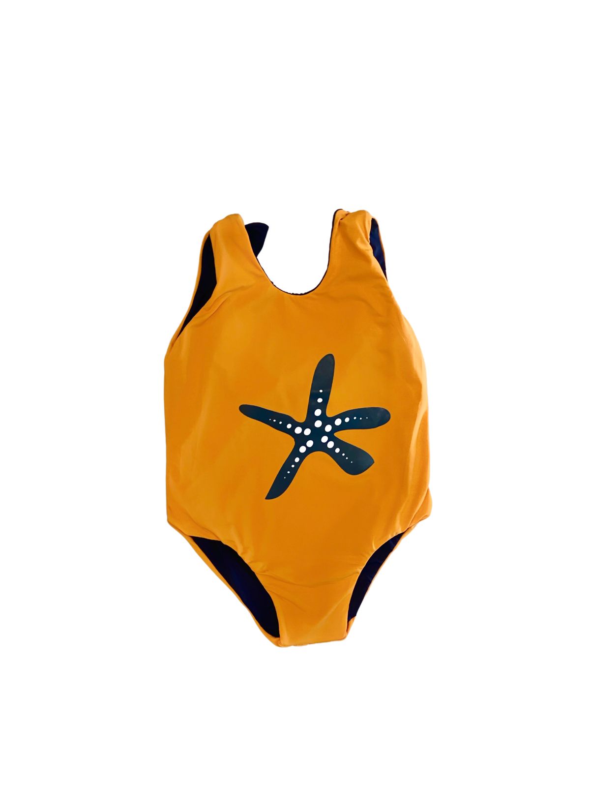 Maiô dupla face bicolor na cor azul marinho com estampa Estrela do Mar na cor laranja da coleção Frutas do Brasil confeccionado em poliamida biodegradável, proteção 50+