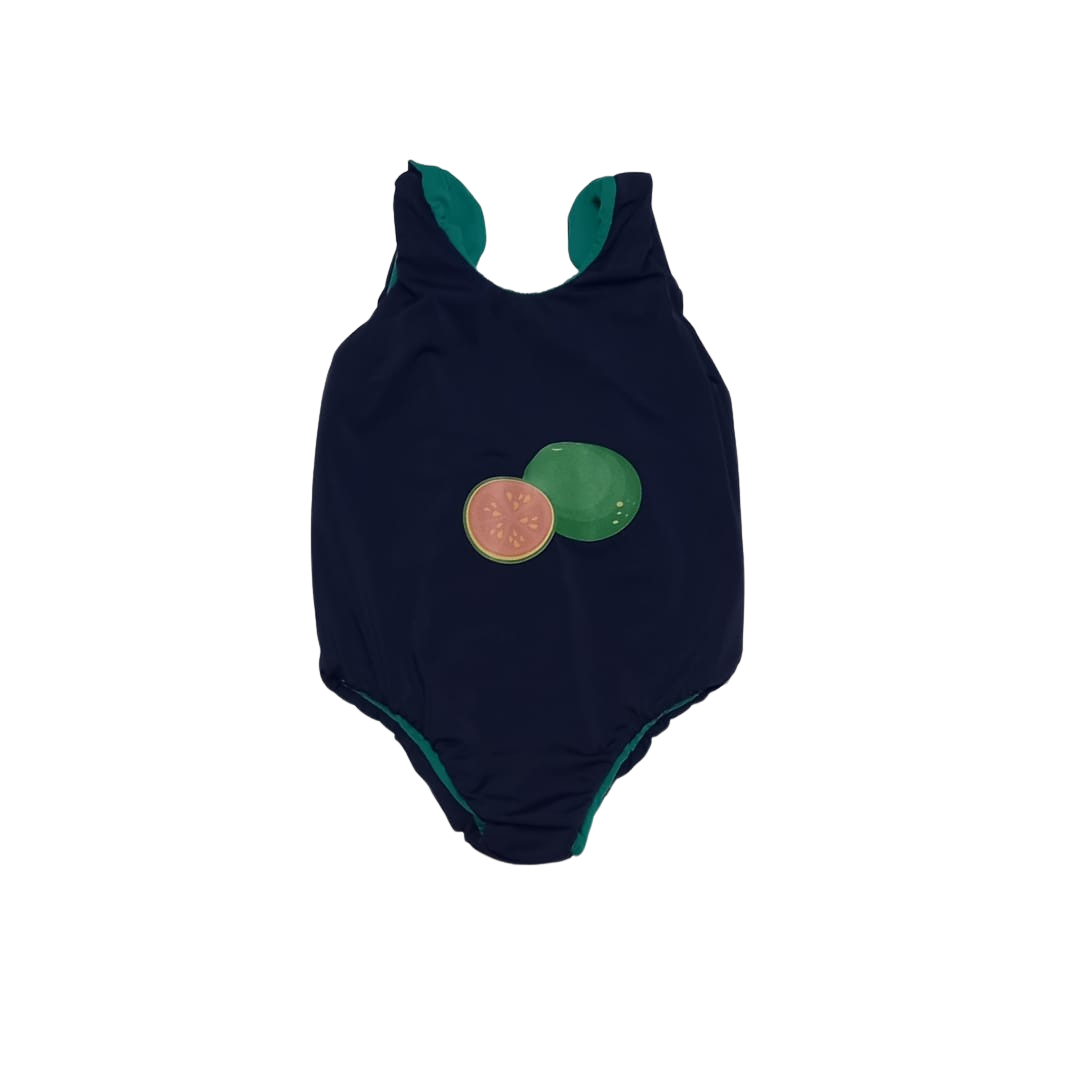 Maiô dupla face com estampa Goiaba da coleção Frutas do Brasil confeccionado em poliamida biodegradável, proteção 50+