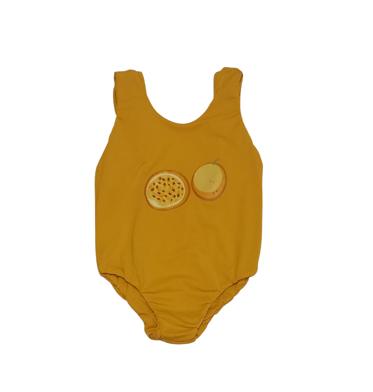 Maiô dupla face com estampa Maracujá da coleção Frutas do Brasil confeccionado em poliamida biodegradável, proteção 50+