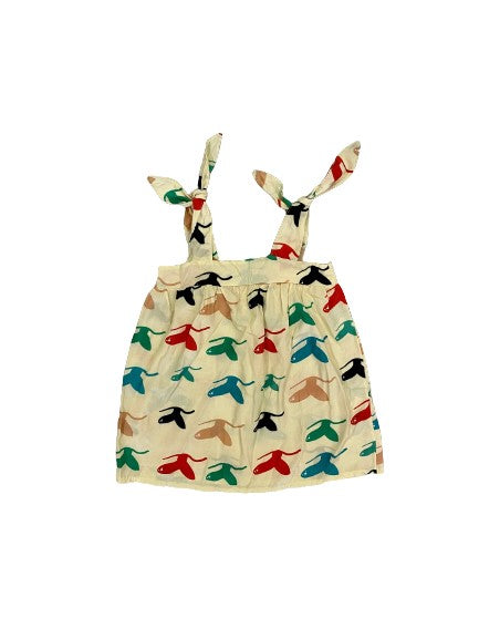 Vestido amplo, soltinho e com tecido levinho para diversas ocasiões, a regulagem da alça por amarração oferece praticidade e modelagem ampla. Vestido na cor amarela claro com estampa dos rabos de baleia.