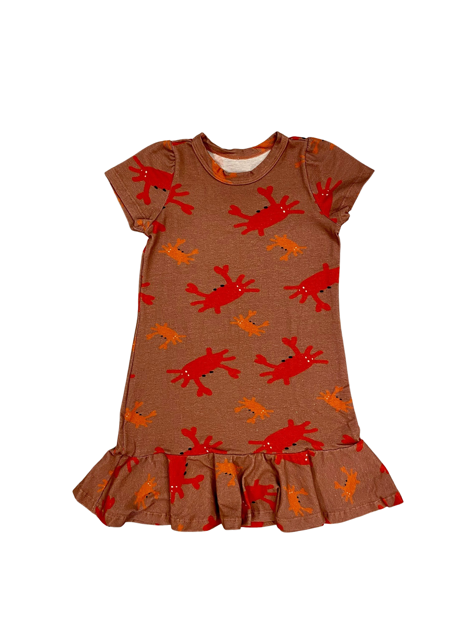 Vestido Midi meia manga com leve abertura na manga e evasê na barra. Nessa estampa o caranguejo encontra-se em seu habitat na cor areia.