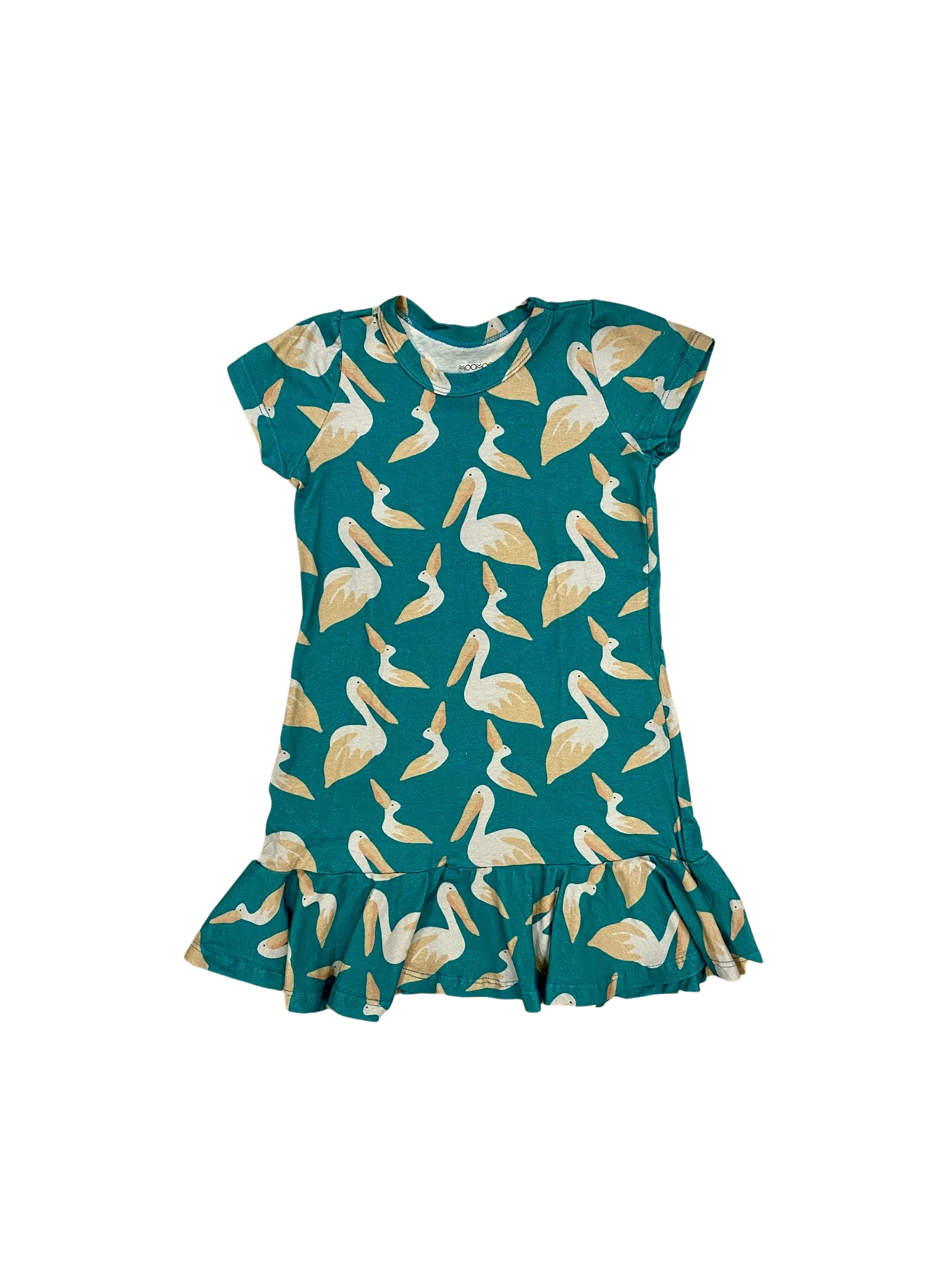 Vestido Midi meia manga com leve abertura na manga e evasê na barra. Nessa estampa observa-se a plenitude do pássaro pelicano.